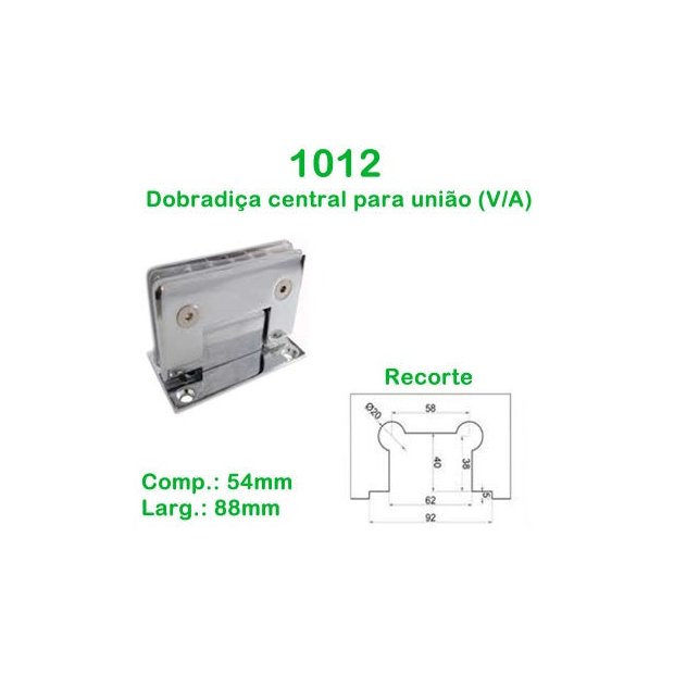 1012- Dobradiça central para união vidro alvenária - Recomendados para utilização em portas e box de banheiro de vidro temperado (Blindex) - Cor: Cromado - Contém: 1 unidade (são necessários no mínimo 2 unidades para a instalação de uma porta) - Espessura de vidros recomendadas: 6mm, 8mm, e 10mm