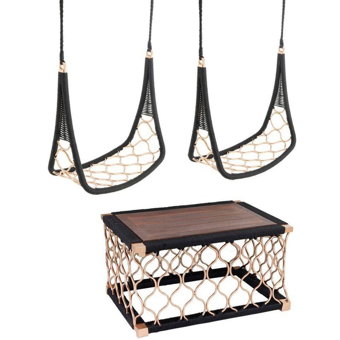 2 Balanços Suspenso E Mesa Tampo De Madeira Em Alumínio Bronze E Corda Náutica Para área Externa - Trama Original