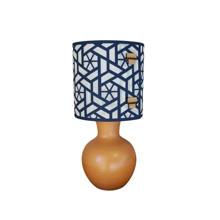 Abajur de mesa com base em cerâmica rústica. Base envernizada. Cúpula revestida com tecido arabesco azul escuro. Cúpula medindo 15 cm de diâmetro e 15 cm de altura. Cúpulas co detalhes para fechamento em madeira.Dimensões totais do produto: Altura: 31 cm Largura: 15 cm.Bivolt. Usar lâmpadas fluorescentes ou LED. Fio preto com plug liga e desliga. Soquete E-27Ficha técnica- Cores: Cerâmica e azul escuro- Largura total: 15 cm- Cor do abajur: Azul escuro- Altura total: 31 cm- Cor da base: Terracota- Diâmetro total: 15 cm