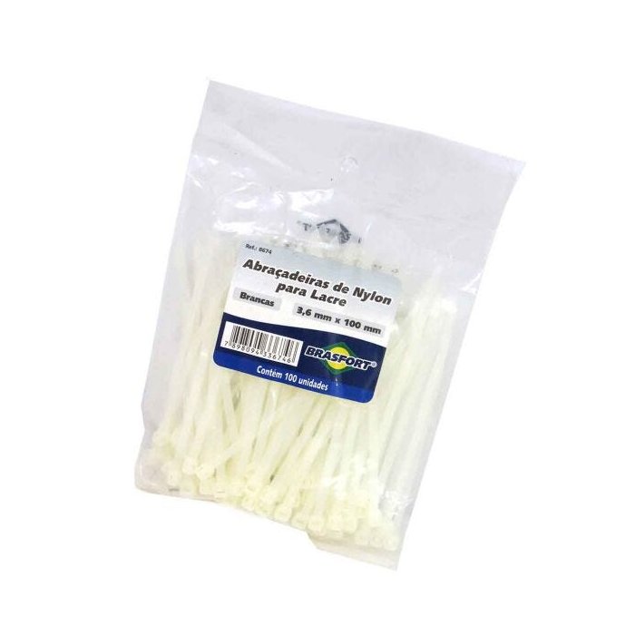 Abraçadeiras de nylon para lacre branco. 3,6mm x 100mm com 100 unidades. Feitas de fibras sintéticas. Ideal para o uso doméstico e industrial, para a fixação diversa em cabos elétricos (chicotes), veículos, bicicletas, motor, embalagens, etc.