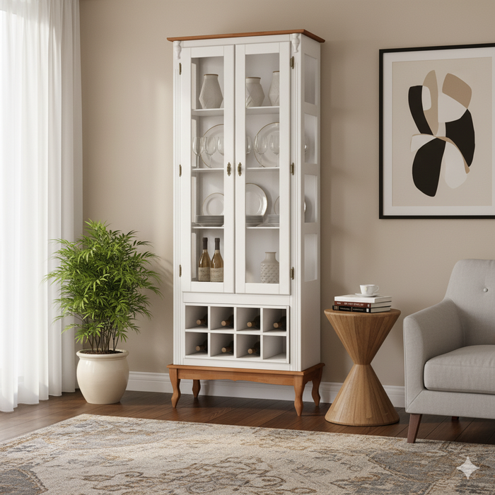 Adega e Cristaleira Colonial com 2 Portas de Vidro e Pés Luiz Xv - Branco Tampo e Base Imbuia Glazer