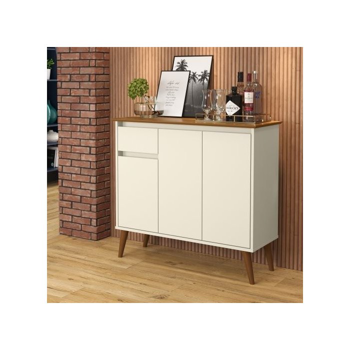 Aparador Buffet Retrô Pés Madeira 3 Portas e Gaveta Veneza:off White/freijó