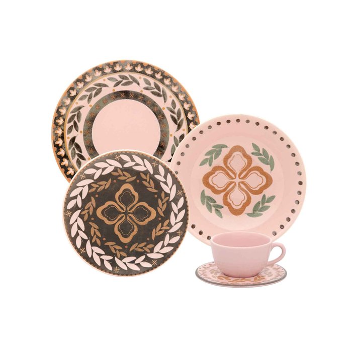 Itens inclusos: 4 pratos rasos com 26 cm de diâmetro / 4 pratos fundos com 20,5 cm de diâmetro / 4 pratos para sobremesa com 19 cm de diâmetro / 4 xícaras para chá com 200 ml de capacidade / 4 pires para chá com 14 cm de diâmetro