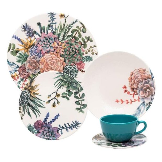 As cores, formas e texturas presentes na flora são uma fonte inesgotável de inspiração. A coleção Unni Bothanica aposta em estampas de bromélias com texturas sobre as peças. A Xícara em cor sólida dá um toque mais contemporâneo à louça. Conteúdo da embalagem: 6 pratos rasos com 26cm de diâmetro / 6 pratos fundos com 20,5cm de diâmetro / 6 pratos para sobremesa com 19cm de diâmetro / 6 Xícaras para chá com 200ml de capacidade / 6 pires para chá com 14cm de diâmetro- Garantia: 12 Meses para Gretagem- Uso: Resistente a micro-ondas e lava-louças- Tipo da embalagem: Papelão pardo- Tipo do jogo: Jantar e almoço- Cor: Multicor- Decoração: Estampado- Material: Cerâmica- Formato: Redondo- Nome do desenho: Unni Bothanica- Quantidade de peças: 30