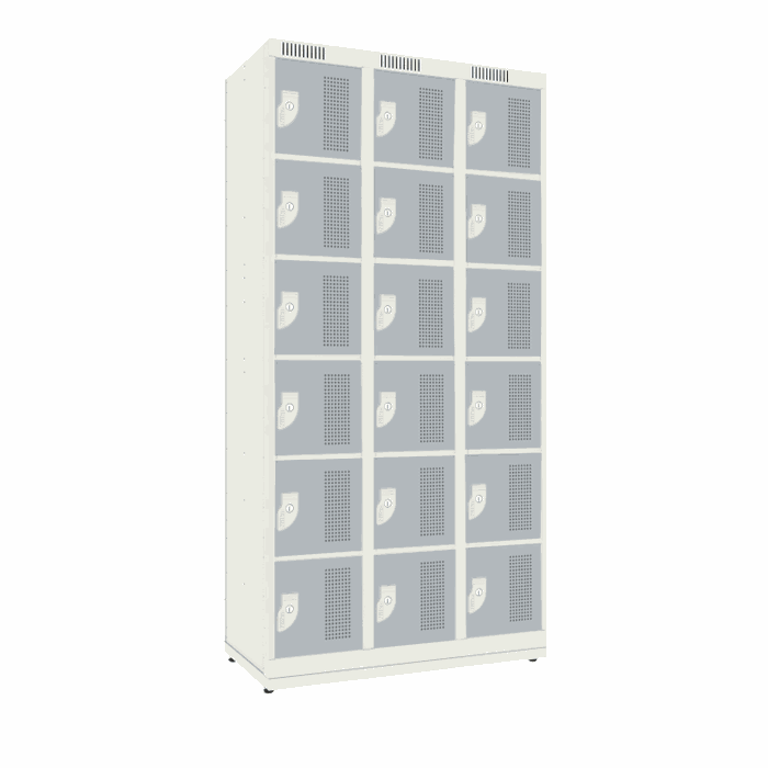 Guarda volumes de aço com 18 portas. Ideal para proteção e segurança de objetos e pertences pessoais ou de trabalho. Muito utilizado em academias, aeroportos, supermercados, hospitais e indústrias.