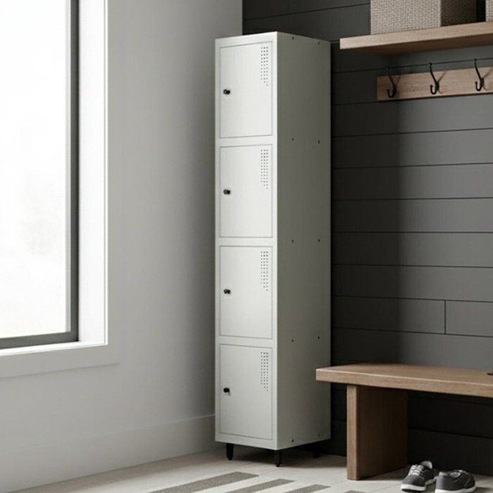 Fabricado em chapa de aço nº 26 (0,45 mm), o roupeiro conta com 4 portas individuais, tratamento anticorrosão e pintura eletrostática a pó.