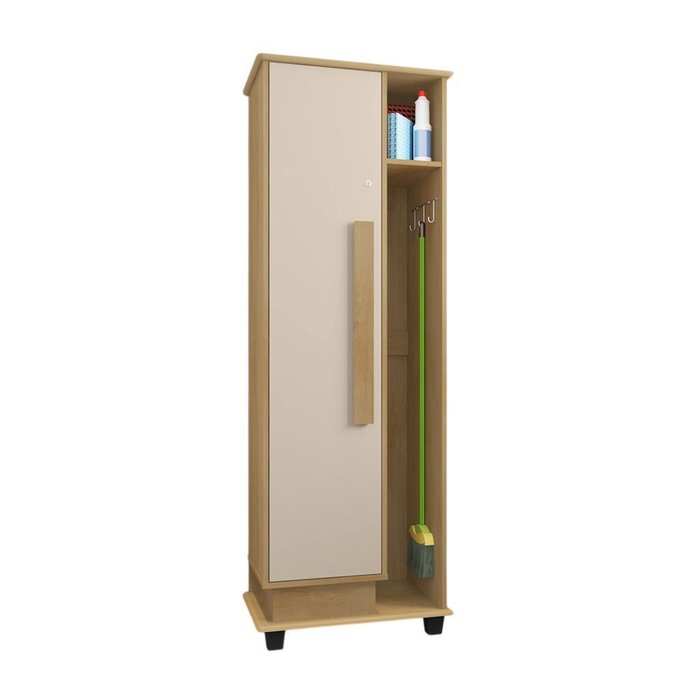 Seu destaque fica por conta do suporte para vassoura, que ajuda a manter tudo no lugar, garantindo mais ordem e fácil acesso. Produzido em MDP de alta qualidade e acabamento em pintura UV fosca, o móvel une durabilidade, beleza e um visual elegante nas cores Cinamomo e Off White.