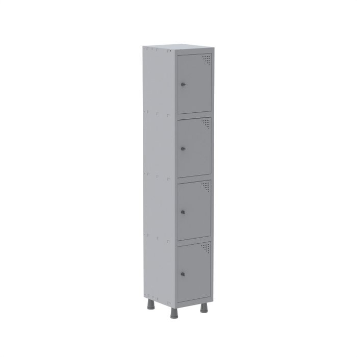 Armário Roupeiro de Aço totalmente montável, dispensa a utilização de parafusos, estrutura em chapas #24 e #26 (0,60mm e 0,45mm) conta com uma porta com estampos circulares em formação triangular para ventilação, sistema de fechamento de varão de 3 pontos, através de pitão para cadeado.