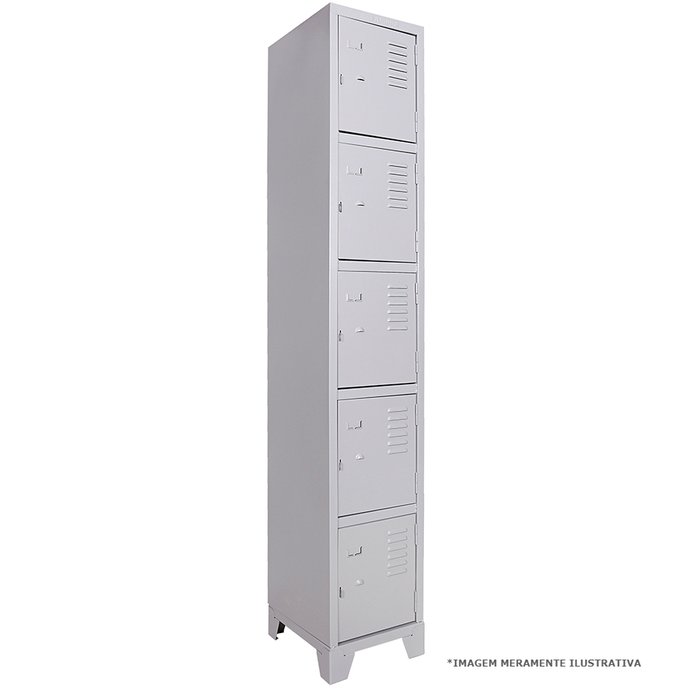CONEXÃO OFFICEArmário Roupeiro de aço para vestiário,ideal para academias, surpermercados, empresa e para uso geral. Produzido em aço chapa 26 0,45mm de alta qualidade com tratamento anti-ferruginoso, o acabamento em sistema de pintura eletrostática a alta temperatura epóxi, tambem garante maior durabilidade da cor e resistencia a ferrugem. Possui 5 portas com venezianas para ventilação, compartimentos de tamanhos médios independentes sem divisórias internas, que garante que você consiga armazenar itens como bolsas, mochilas e entre outros. O fechamento das portas é através de chave. Características- Quantidade de Portas: 5- Cor: Cinza Padrão- Chapa: 26 / 0,45mm- Medida das Portas/ Vãos: 035Alt x 026Larg- Sistema de Ventilação: Veneziana- Fechamento: chave- Quantidade de cabides por porta: 0- Pés removíveis: Não- Desmontável: Não ( Exceto portas que podem ser trocadas ).- Pintura: Epóxi PóALTURA: 197cmLARGURA: 32cmPROFUNDIDADE: 36cmPESO: 25 KgGARANTIA: 3 MesesEspecificação de chapa e acabamento: Roupeiro produzido em chapa de aço tratada com antiferruginoso por fosfatização e pintura epóxi-pó por processo
