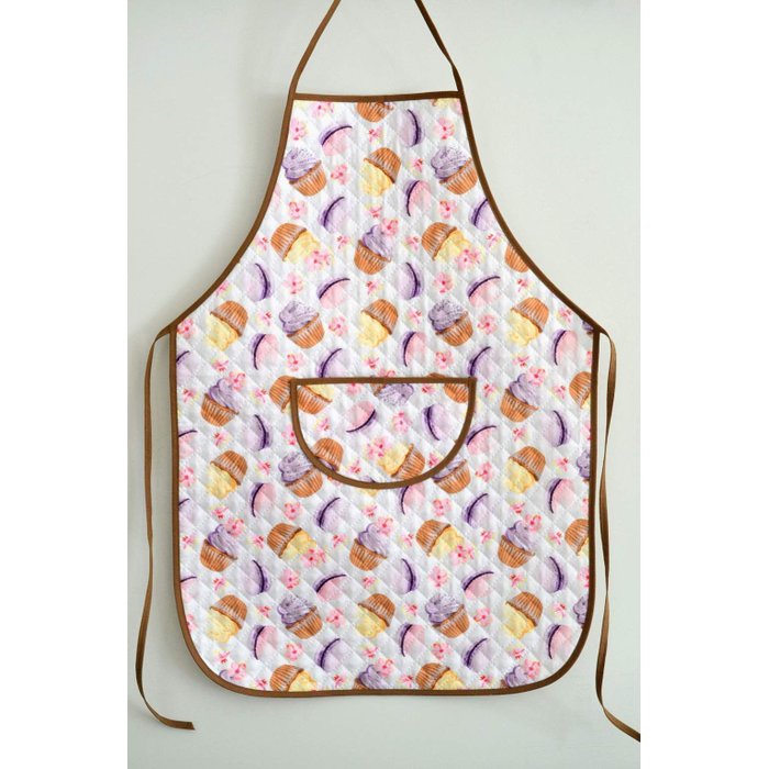 Avental fabricado em tecido matelado e estampado na parte da frente e plástico leitoso na parte de trás, com estampa de cupcakes, macarons e flores, com fundo branco e com tons de bege, rosa e lilás, com bolso frontal e acabamento em viés na cor bege.