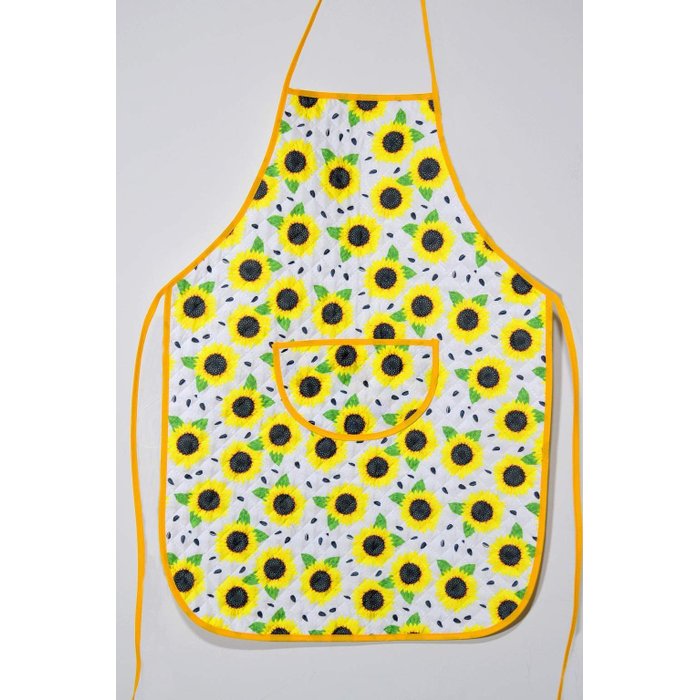 Avental fabricado em tecido matelado e estampado na parte da frente e plástico leitoso na parte de trás, com estampa de girassol, com fundo branco e tons de amarelo, preto e verde, com bolso frontal e acabamento em viés na cor amarelo.