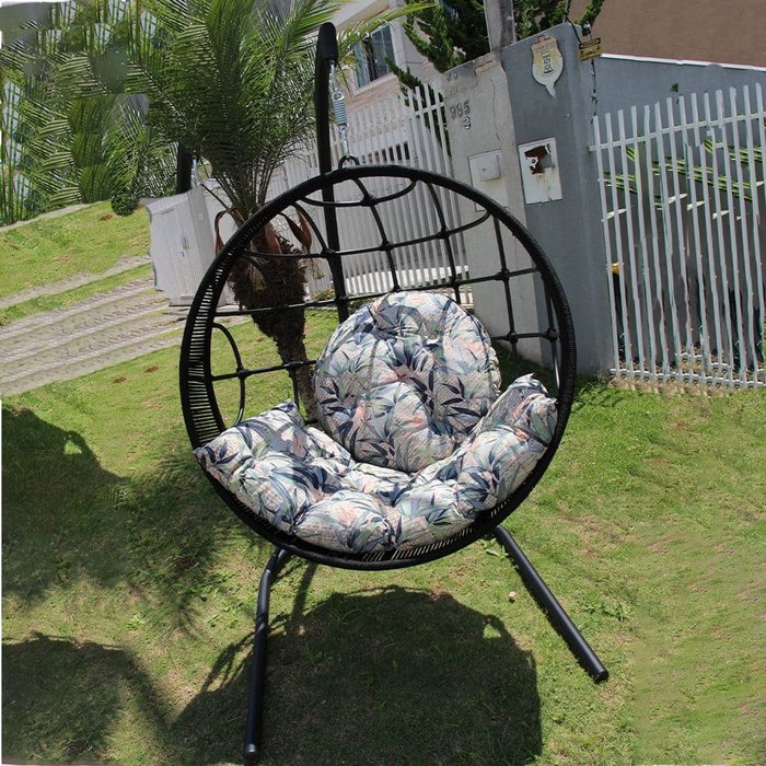 O revestimento do balanço é trançado em corda náutica com tratamento UV e o suporte possui estrutura de aço.