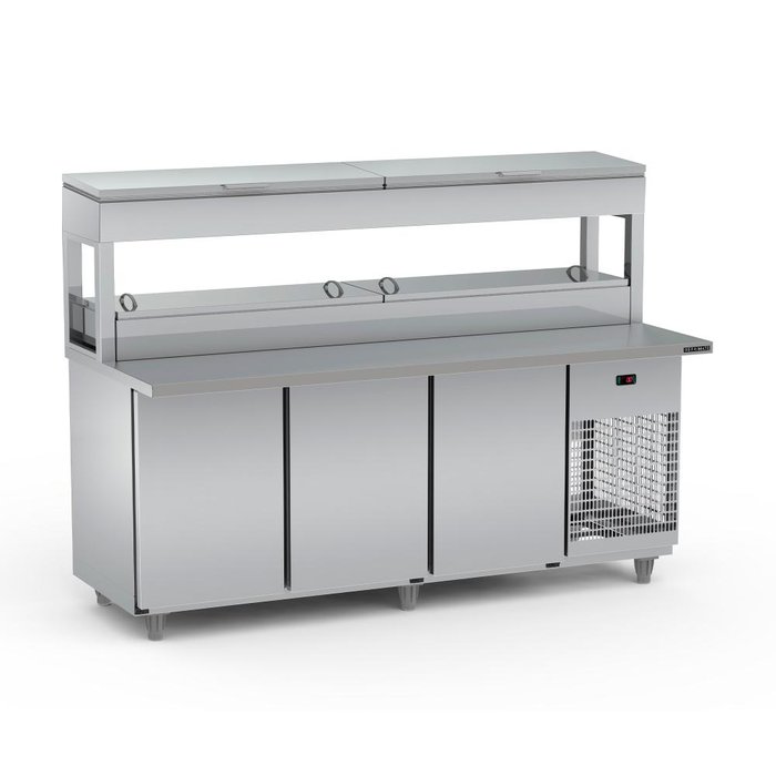Especificações Técnicas: Modelo: BSRCDTE 2000 Temperatura resfriados: 0ºC a 5ºC Refrigeração: Ar forçado Controlador digital de temperatura Gabinete interno em aço galvanizado Gabinete externo (frente e laterais) em aço inox 430 brilhoso. Base e costas em aço galvanizado Kit condimentador superior refrigerado com tampa basculante em aço inox brilhoso Kit condimentador inferior refrigerado instalado sobre o tampo Isolamento térmico em poliuretano injetado Sistema de armazenamento com grades tipo aramado, com regulagem de altura por sistema de encaixe, cremalheiras e suportes em alumínio, além de numeração para facilitar o ajuste de altura Pés com regulagem de altura Quantidade de portas: 03