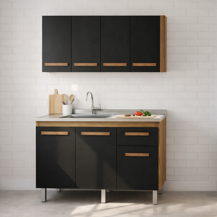 O Balcão de Pia Anita 1,20 m e o Aéreo Mara 4 portas, na elegante cor Savana Preto, trazem harmonia e organização para o seu dia a dia. Mais espaço, mais praticidade e um toque sofisticado para deixar sua cozinha do jeito que você sempre sonhou!