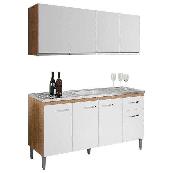 Começou a procurar móveis para sua cozinha? Então apresentamos para você este belo conjunto composto pelo balcão da linha Gabriela e o armário da linha Andréia. O balcão conta com três portas e uma gaveta com corrediças metálicas garantindo mais suavidade ao uso diário, enquanto seus pés em PVC entregam mais estabilidade e proteção conta a umidade. Completando o conjunto, o armário possui quatro portas, assim como o balcão tem puxadores em PVC e uma prateleira, ideal para organizar utensílios e mantimentos. Satilde;o desenvolvidos em 100% MDP de qualidade. Sendo ideal para quem busca praticidade, resistência e um visual moderno para sua cozinha. Aproveite e garanta já o seu!
