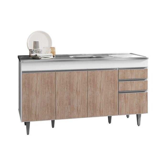 Balcão Gabinete com Pia Inox 150cm 4 Portas 2 Gavetas Marrocos Branco/castanho - Lumil