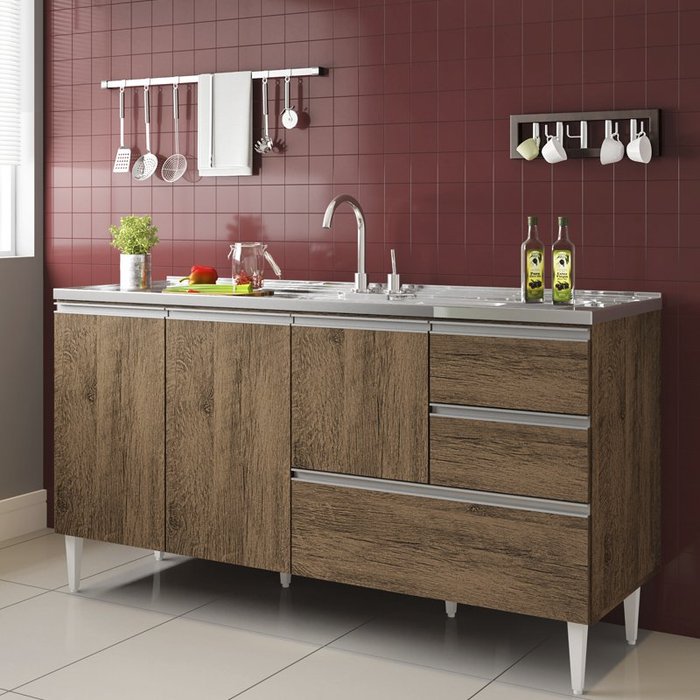 O Balcão para pia de 1,60 metro Maceió com gavetão, é fabricado em MDP de 15mm para maior durabilidade, pintura com acabamento uv Castanho fosco. O Balcão para pia Maceió possui corrediças telescópicas nas gavetas e no gavetão, todas as portas possuem dobradiças metálicas. Moderno o Balcão para pia Maceió possui puxadores perfil aluminio em todas as portas, gavetas e gavetão. Com uma prateleira interna na porta menor. Pés de plástico com regulagem de altura para correção de possiveis desniveis. DimensõesAltura 83 cm Largura 157 cm para pia de 160 cm Profundidade 50 cm Sistema De MontagemParafusos, Cavilhas. Recomendação de LimpezaLimpar com pano seco e ou levemente umdecido. Não aplicar produtos quimicos.Este produto Não Acompanha Tampo ou Cuba para Pia. * Foto Ilustrativa.Não acompanhando objetos de enfeites e eletros;Ao receber o produto verifique as condições da embalagem, em caso de avaria entre em contato conosco para orientações;Confira as dimensões do produto e certifique-se de que passarão normalmente por supostos elevadores, portas, escadas ou corredores de sua moradia;Entregamos os produtos até a frente de sua moradia, ou seja, até sua porta se for casa ou portaria se for apartamento.A loja não disponibiliza o serviço de montagem, a montagem é de total responsabilidade do comprador.Recomendamos que a montagem seja feita por um profissional da área.