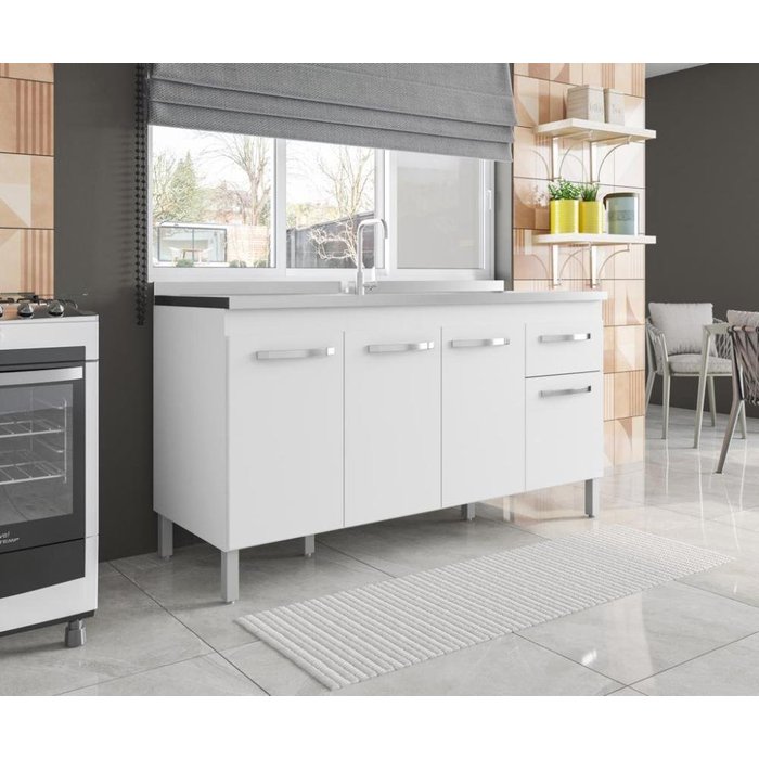 Balcão para Pia sem Tampo 4 Portas 1 Gavetas Lara Branco 150cm Branco