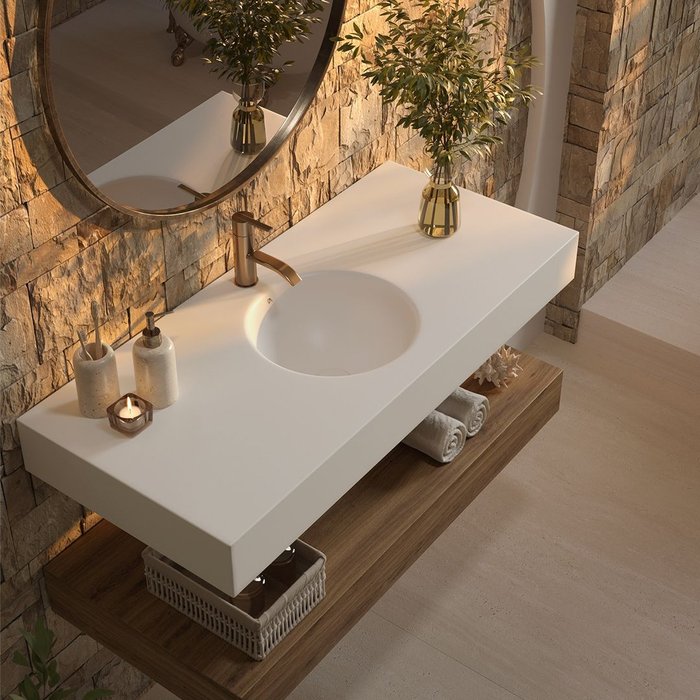 Dê um toque de luxo ao seu banheiro com a Bancada de Banheiro com Cuba Esculpida Redonda Cristal da Don Artesano. Fabricada em Superfície Sólida Mineral, é durável, resiste a manchas e é fácil de limpar. Suave ao toque e com acabamento impecável, ela transforma qualquer ambiente em um espaço exclusivo e refinado!
