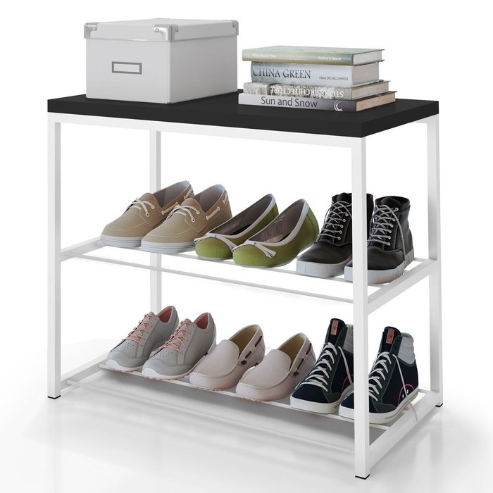 Banco Sapateira para Organizar Calçados com Tampo em Mdp e Aço Aramado Branco/Preto