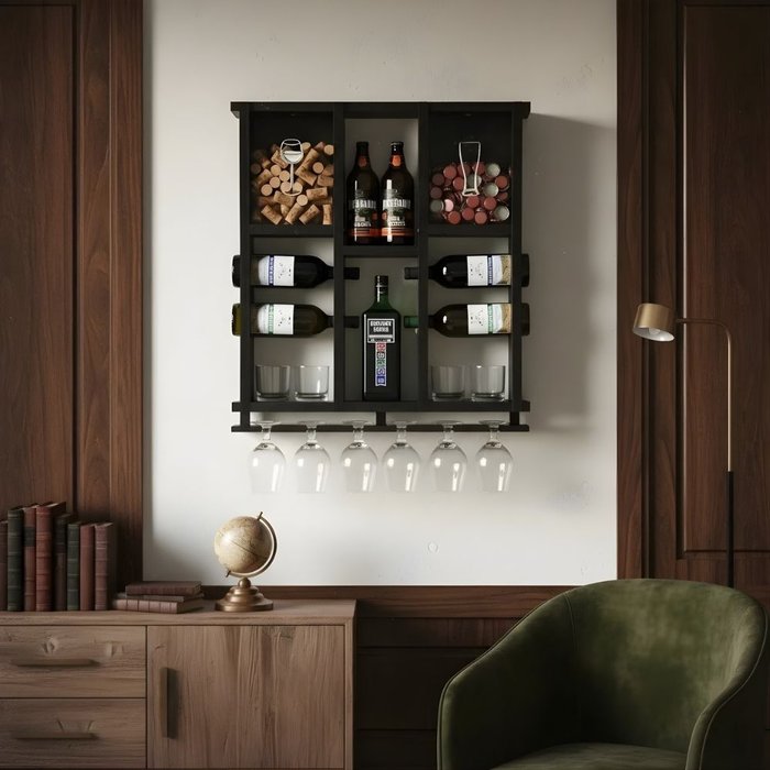 Adega Barzinho de Parede em Madeira Maciça com Porta Rolhas, Porta Tampinhas e Porta Taças