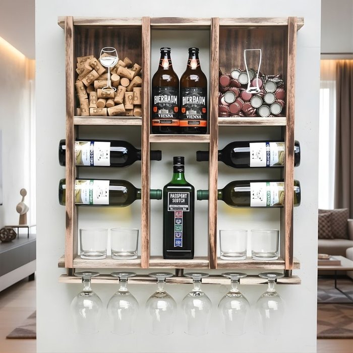 Adega Barzinho de Parede em Madeira Maciça com Porta Rolhas, Porta Tampinhas e Porta Taças