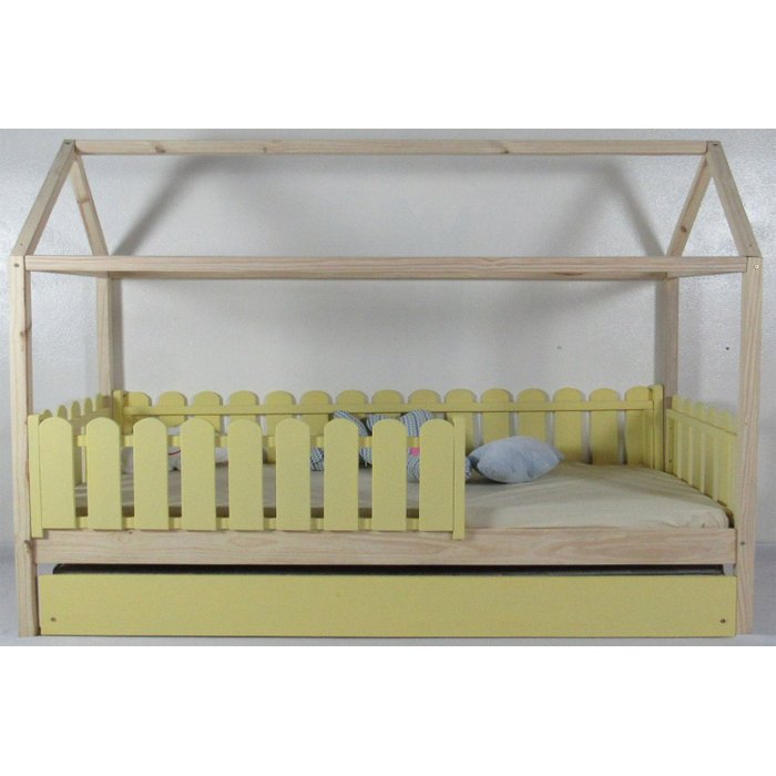 Bicama Infantil Solteiro Casinha Colorida Madeira Maciça Pinus Grade Cercadinho Verniz + Amarelo