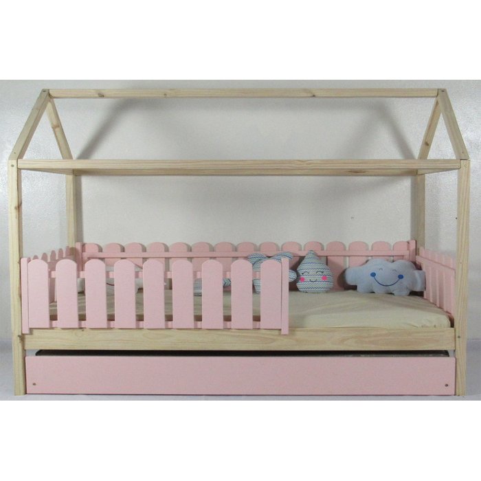 Bicama Infantil Solteiro Casinha Colorida Madeira Maciça Pinus Grade Cercadinho Verniz + Rosa