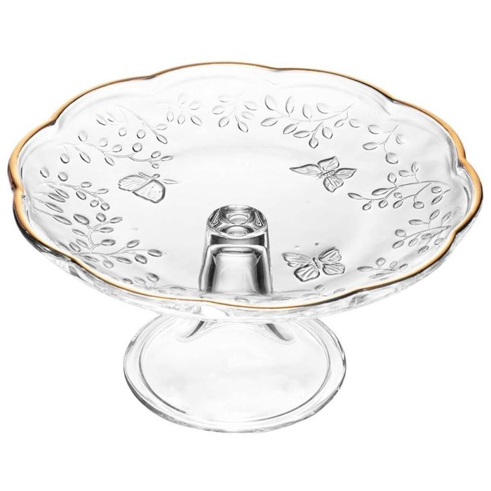 Boleira com Pé Vidro Cristal Prato para Bolo Redondo 19cm Lyor New Butterfly Fio de Ouro.