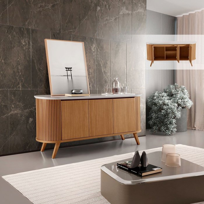 Buffet Aparador 3 Portas Ripado com Pés em Madeira Maciça Luna
