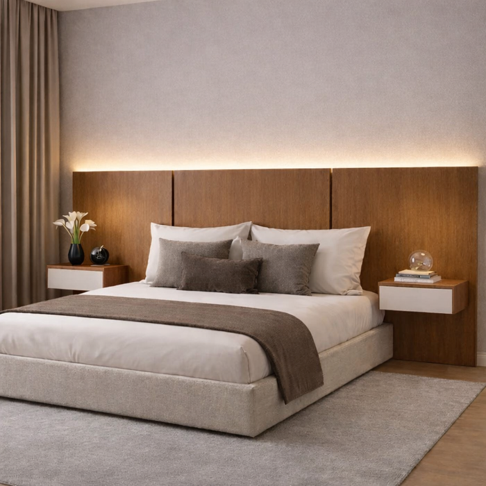 A Cabeceira Casal Lumina Box com LED e 2 Mesas de Cabeceira é a escolha perfeita para quem busca sofisticação e funcionalidade no quarto. O produto já vem com LED integrado, criando uma iluminação aconchegante e moderna, ideal para valorizar o ambiente. Com pintura UV, oferece maior durabilidade, acabamento uniforme e fácil manutenção no dia a dia. Seu design elegante combina as cores tendência Off White e Freijó, trazendo leveza e requinte ao espaço. Possui 110 cm de altura, 270 cm de largura e 38 cm de profundidade, garantindo presença marcante e excelente aproveitamento. Um móvel imponente, atual e extremamente comercial, pensado para transformar o quarto em um ambiente moderno e acolhedor.
