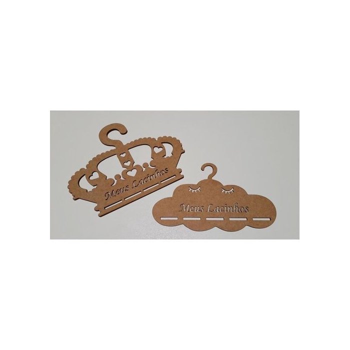 Cabides Porta Laços 2 MODELOS - Kit com 10 peças.5 Cabides de Nuvem, escrito "Meus Lacinhos" com 5 aberturas para fita.Medidas 27 x 17 cm+5 Cabides de Coroa, escrito "Meus Lacinhos" com 4 aberturas para fita.Medidas 30 x 25 cmEspessura: 3 mmProduto em MDF cru (sem pintar)Não acompanha a fita de cetim.