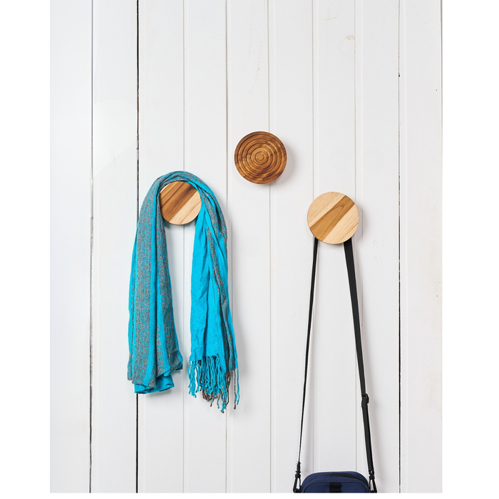 Conjunto com 3 cabideiros em madeira teca maciça Acabamento premium com detalhe entalhado exclusivo Fixação oculta para um visual limpo e elegante Suporte firme para bolsas, roupas, acessórios e mais Peça funcional que também decora