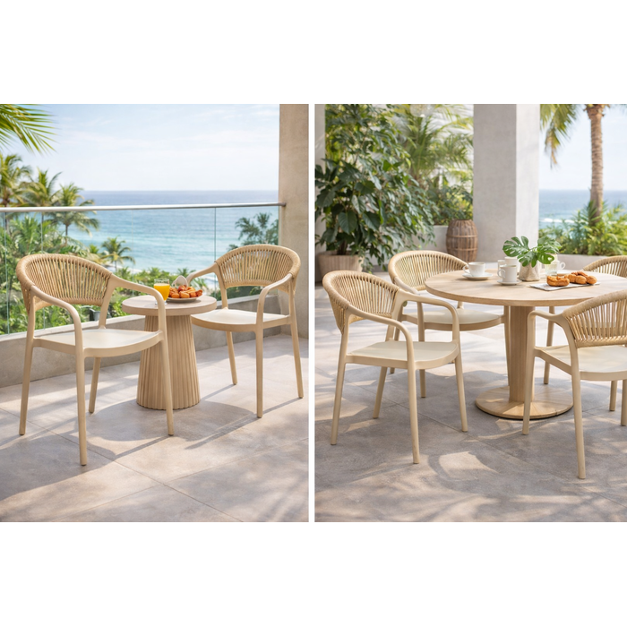 A cadeira Juna é perfeita para áreas externas, como jardins, varandas e espaços de lazer. Fabricada em polipropileno, é resistente às variações climáticas e fácil de limpar, ideal para o uso ao ar livre. Seu encosto em corda de ratan sintético confere charme artesanal ao design, além de proporcionar conforto e leveza ao visual. Versátil e durável, a Juna une praticidade e estilo, sendo uma excelente opção para compor ambientes externos com elegância e funcionalidade.