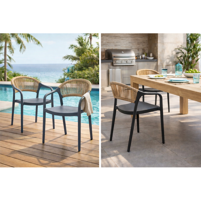 A cadeira Juna é perfeita para áreas externas, como jardins, varandas e espaços de lazer. Fabricada em polipropileno, é resistente às variações climáticas e fácil de limpar, ideal para o uso ao ar livre. Seu encosto em corda de ratan sintético confere charme artesanal ao design, além de proporcionar conforto e leveza ao visual. Versátil e durável, a Juna une praticidade e estilo, sendo uma excelente opção para compor ambientes externos com elegância e funcionalidade.