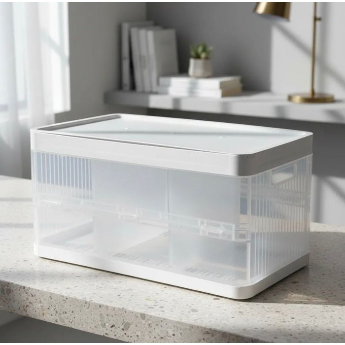 Com apenas 5 cm de altura quando dobrada, esta caixa é extremamente fácil de transportar e guardar. Seu design versátil permite utilizá-la em diversos ambientes desde o quarto até o escritório e lavanderia sempre mantendo tudo em ordem.