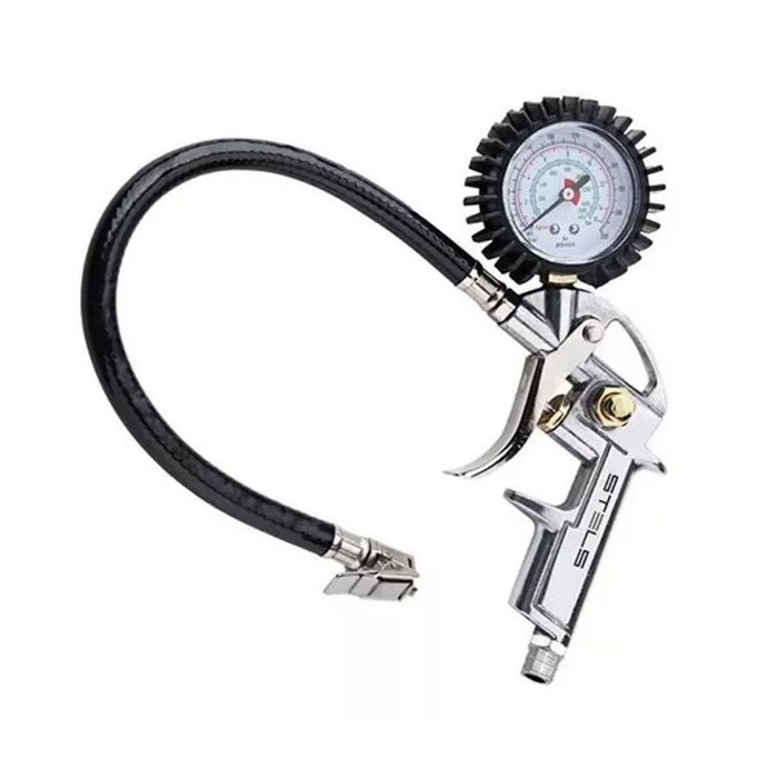 Calibrador de pneus pneumático com engate rápido 1/4, indicado para inflar, esvaziar e medir a pressão de pneus com praticidade. Equipado com manômetro, proporciona leitura precisa e agilidade no uso em veículos leves.