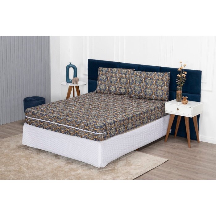 Capa de Colchão Queen 30cm + Fronha Protetor com Zíper Malha Estampada:25 Azulejo Azul Marinho