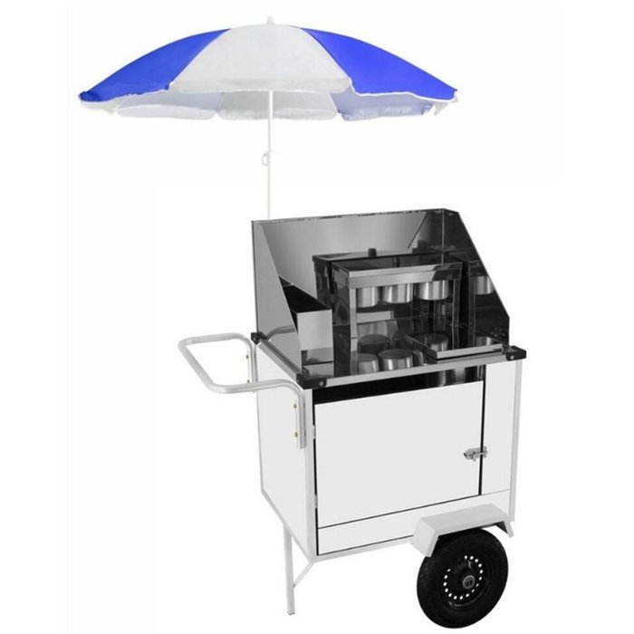 Conheça mais sobre o Carrinho ambulante de Cachorro Quente com Guarda Sol e Rodas Pneumáticas