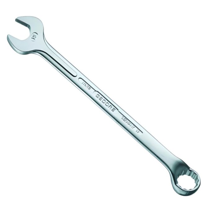 Aço Gedore-Vanadium. Acabamento niquelado e cromado. Chave combinada com um lado boca e outro Unit Drive com as mesmas medidas. A Unit Drive proporciona uma distribuição uniforme da força aplicada na parte central do sextavado, não havendo deformação dos cantos das porcas e parafusos. Inclinação em relação ao corpo: boca 15º e Unit Drive 10º. Parede fina. Chave combinada bitolas: 1/4" à 1.1/4", são encarteladas para autoserviço.