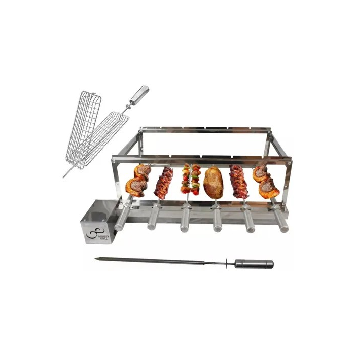 Conteúdo da Embalagem: 1 Painel com Motor + 4 Cantoneiras + 4 Laterais + 1 Traseira + 2 Descansos Superior +26 Parafusos + 26 Porcas + Manual de Instruções + 6 Espetos Tridentes de Inox com cabos de madeiras revestidas em Alumínio + 1 Espetos Espadas + 1 Espeto Grelha