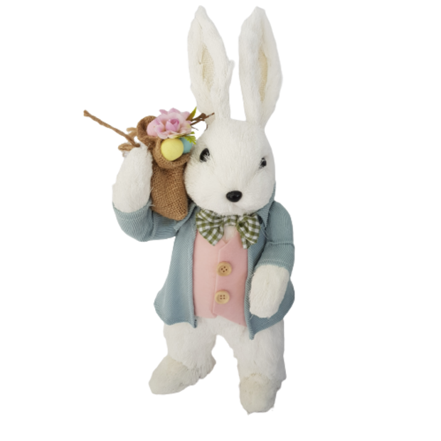 COELHO DE PÁSCOA 42cm DE ALTURA CARREGANDO CESTO DE RAFIA COM OVOS E FLORES, CONFECCIONADO EM EPS E ARAME, REVESTIDO COM FIOS DE SISAL BRANCO, VESTE CASACO AZUL COM COLETE DE FELTRO ROSA E GRAVATA BORBOLETA XADREZ.
