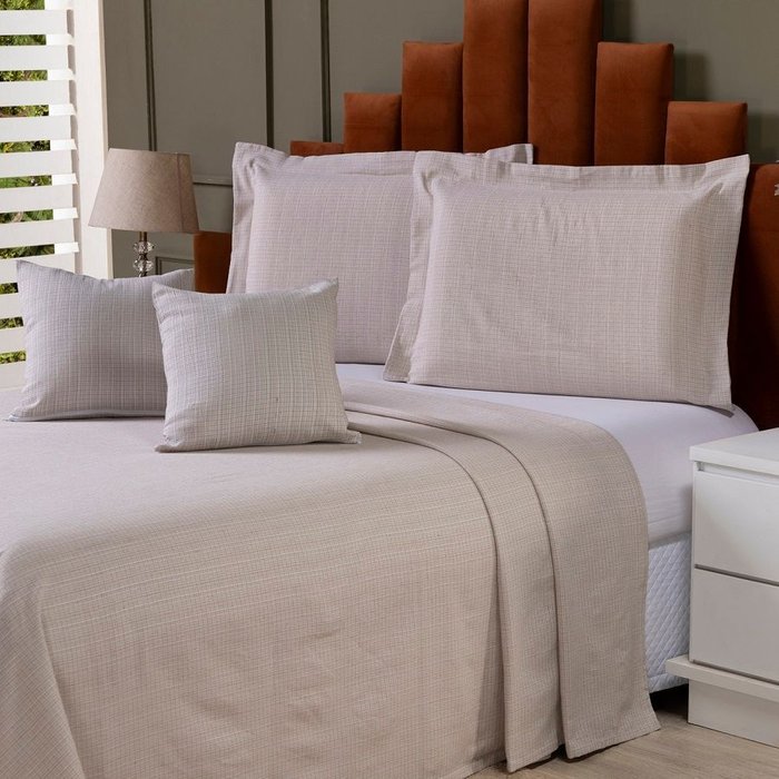 Colcha Cobre Leito Queen 5p Tecido Rústico Topázio com Capa de Almofada Bege Avelã