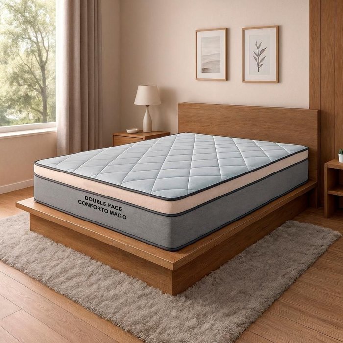 • Sitema Double Face. Um lado do colchão com conforto macio, e outro lado com conforto mais firme, deixando duas opções de conforto no mesmo produto.