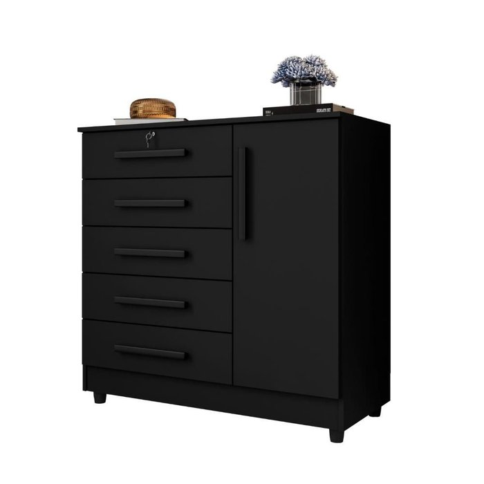 Cômoda Grande 5 Gavetas 1 Porta com Chave Elegante Preta