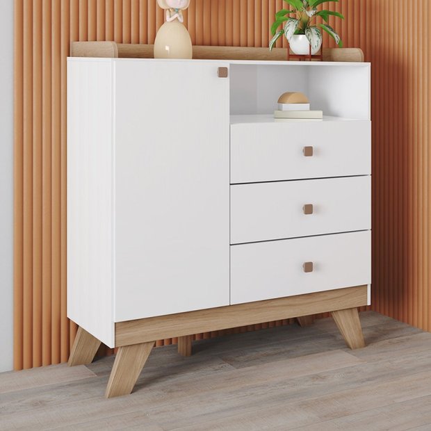 A Cômoda Retrô Theo possui design retrô e elegante, com 3 gavetas e 1 porta e 1 prateleira e 1 nicho, possui espaço perfeito para organização desde roupas até acessórios de seu bebê. As corrediças telescópicas proporcionam um fechamento deslizante suave e seguro, com acabamento em pintura UV e detalhes como puxadores em madeira com pintura garantem a beleza e sofisticação que o quarto do seu bebê merece.