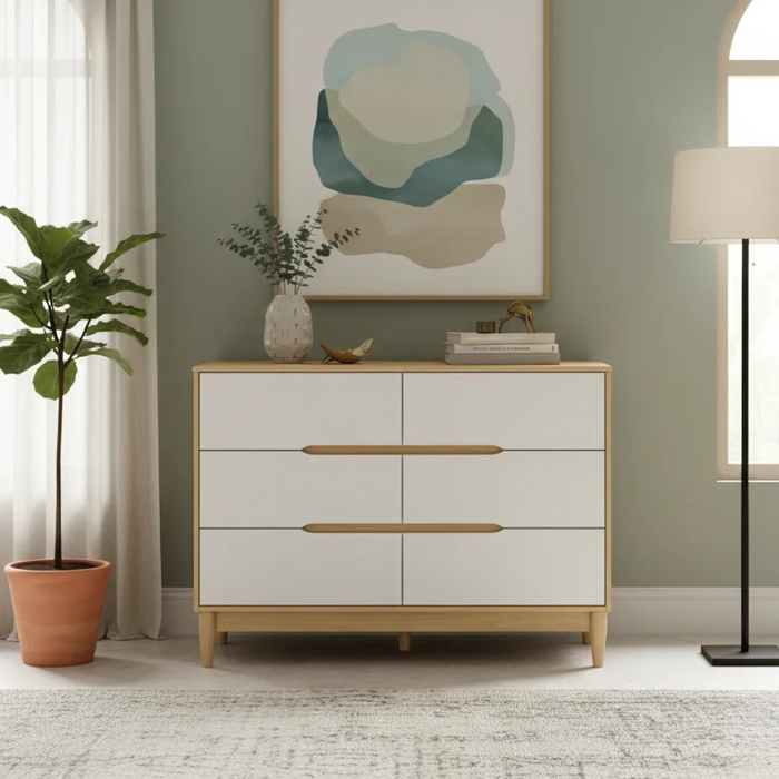 Cômoda Infantil Grande 6 Gavetas Branco com Carvalho Linha Tomi Marca Quater Móveis