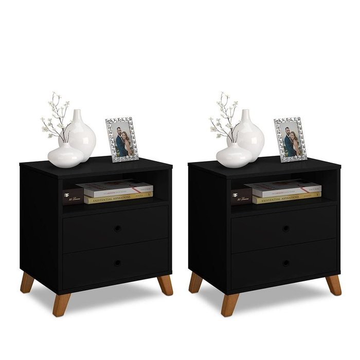 Conjunto 2 Criados de Cabeceiras 2 Gavetas e 1 Nicho Preto Preto