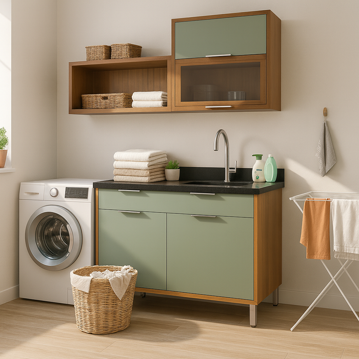 Conjunto de Armários Modulares para Lavanderia – Balcão 120 cm + Aéreos 160 cm – Design Moderno em Madeira & Porta Basculante com Vidro Transforme sua lavanderia em um ambiente moderno, organizado e sofisticado com este conjunto modulado completo. Conjunto Completo com Medidas Perfeitas Balcão Inferior – 120 cm Largura: 120 cm Altura: 92 cm Profundidade: 51 cm Possui 2 portas inferiores com amplo espaço interno Estrutura reforçada com pés metálicos elevados, facilitando a limpeza Armário Aéreo – Conjunto 160 cm O aéreo é formado por duas unidades de 80 cm cada, totalizando 160 cm de largura: 1. Aéreo Nicho Aberto – 80 cm Largura: 80 cm Altura: 30 cm Ideal para toalhas, cestos, produtos decorativos e objetos de fácil acesso 2. Aéreo com Portas – 80 cm Largura: 80 cm Altura total: 72 cm Dividido em: Porta superior basculante Porta inferior com vidro, permitindo visualização interna Excelente para organização de produtos, potes, itens de limpeza e objetos decorativos Materiais e Acabamento Estrutura em MDF com revestimento madeirado Portas e frentes em acabamento fosco Puxadores e pés metálicos de alta durabilidade Dobradiças e ferragens reforçadas Vidro no aéreo Ideal Para: Lavanderias compactas ou grandes Ambientes planejados Uso residencial ou comercial Vantagens do Conjunto Modular: pode ser instalado conforme o seu espaço Grande capacidade interna em todos os módulos Espaço para máquina de lavar e área de trabalho Conteúdo do Kit 01 Balcão 120 cm com 2 portas 01 Aéreo aberto de 80 cm 01 Aéreo basculante + porta de vidro 80 cm Puxadores e ferragens Pés metálicos Manual de montagem Observação Importante As imagens ambientadas são ilustrativas, mas representam exatamente o modelo, proporções e acabamentos reais do conjunto. A torneira, cuba, eletros e objetos decorativos não estão inclusos (quando aplicável).