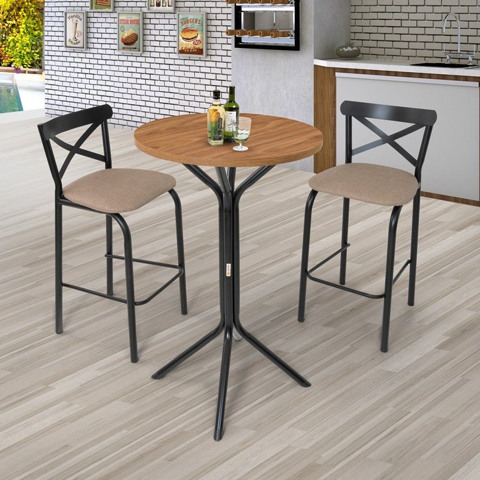 Conjunto Bistrô Tampo 0,65m Redondo com 2 Banquetas Tubo Paris Preto/Bege/Marrom